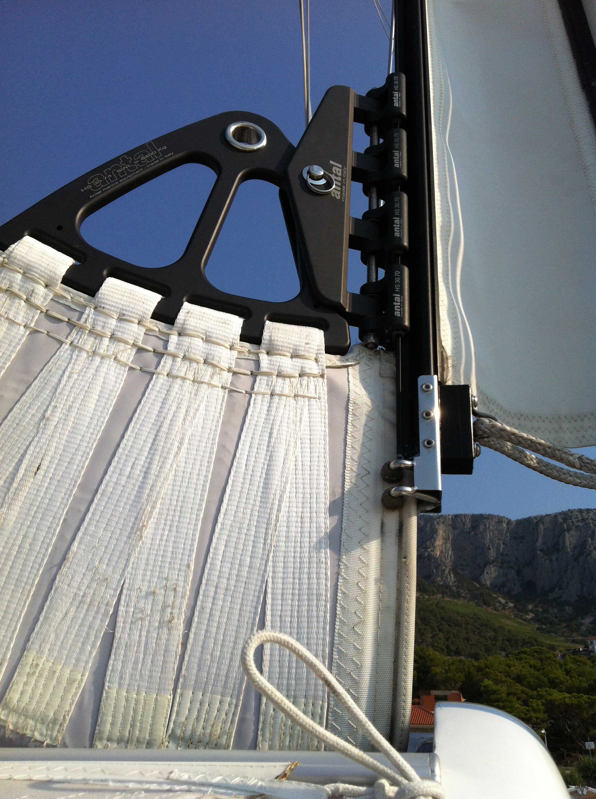 To accommodate the demand on Furlerbooms for large multihull and heavy displacement yachts the new “mast track 2” has been launched. Based on the experience with “mast track 1” a number of advantages have been build in: Hard black anodizing ensures better protection against corrosion and less friction under high load. Different sizes of headboard car available depending on calculated load. The no-ball bearing headboard car ensure a well proven trouble free function also in sandy environments. The groove track is made to slide from below over a support track and can be fitted on a standing masts if needed.